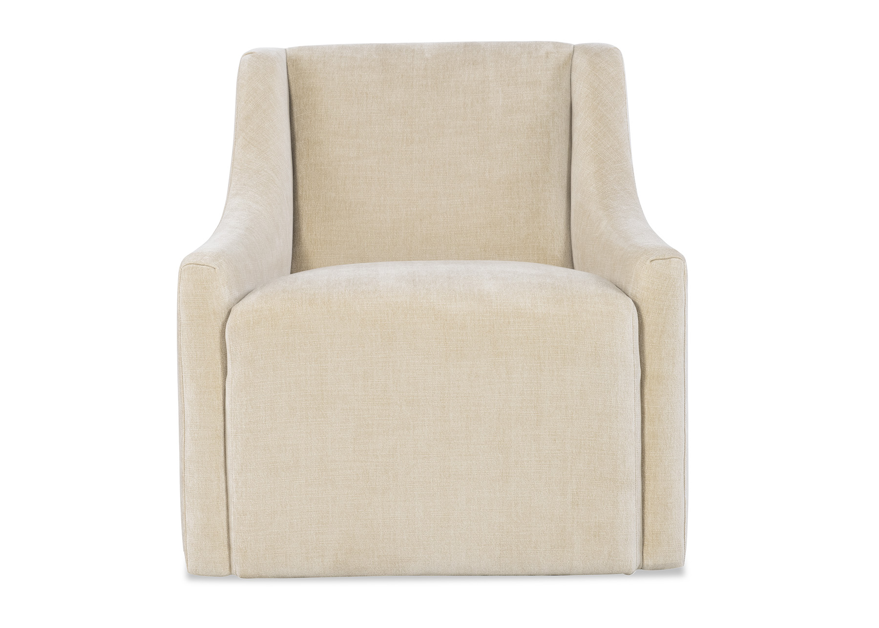 Transitional swivel rocker with tight seat and low arms.