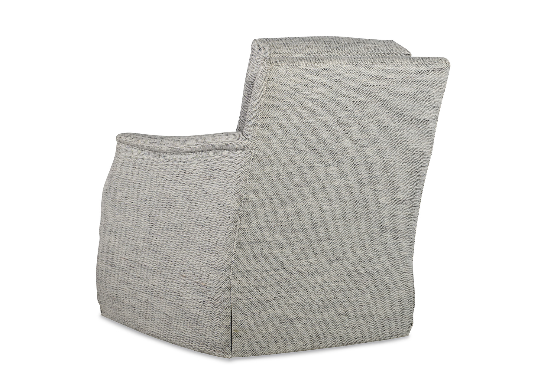 This swivel glider chair has a relaxed, contemporary silhouette with gently curved arms and a tailored skirt. The plush cushion invites you to sit back and unwind.