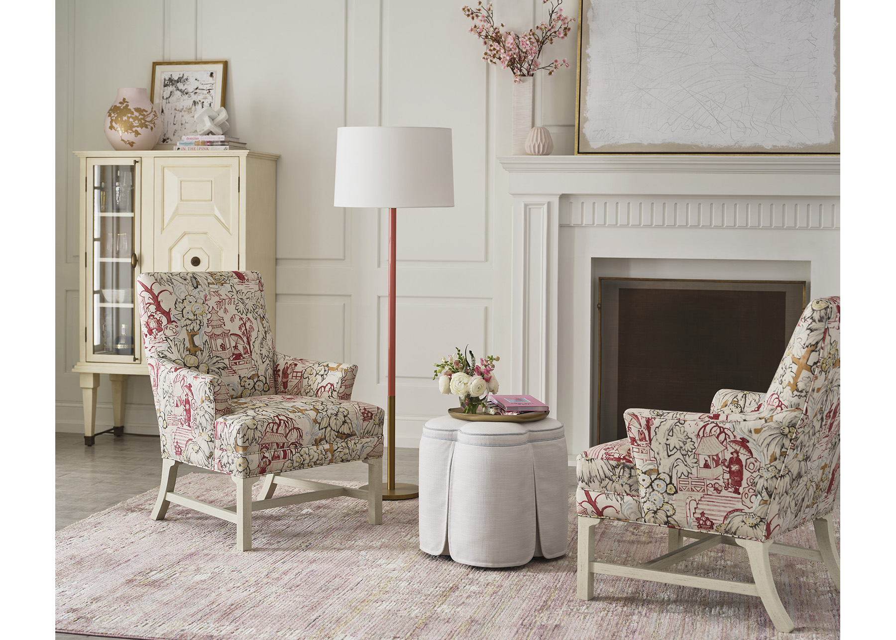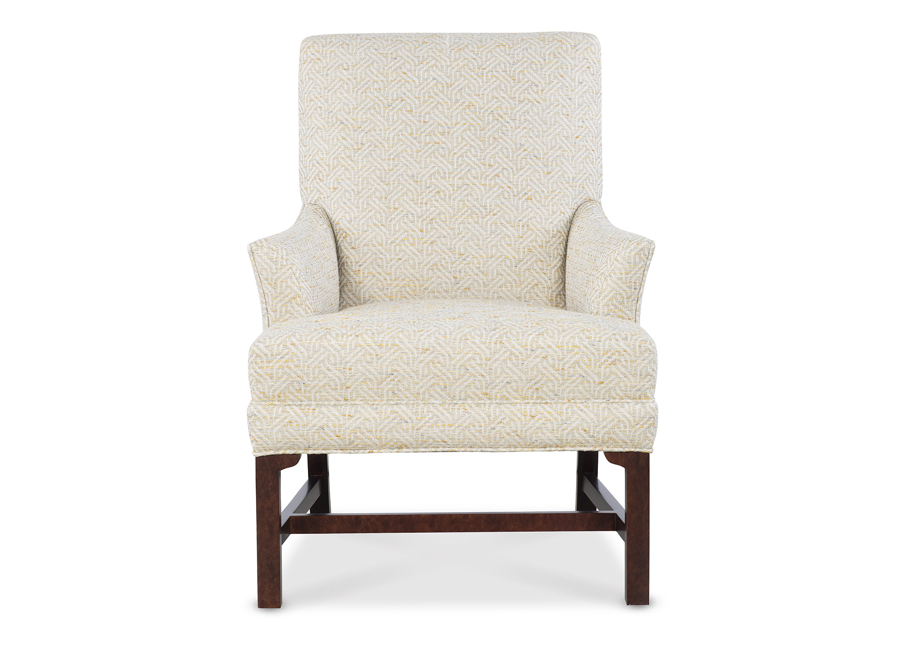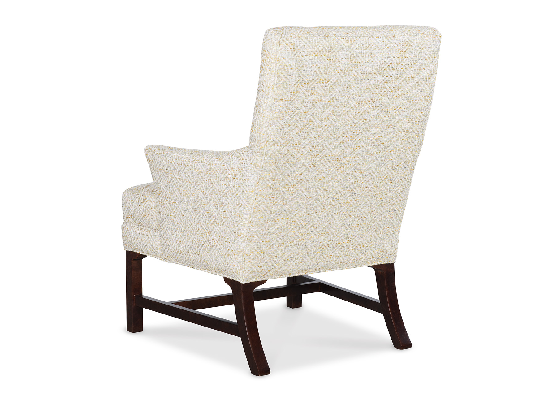 Updated rendition of a classic wood base, tight back, sculpted arm accent chair.