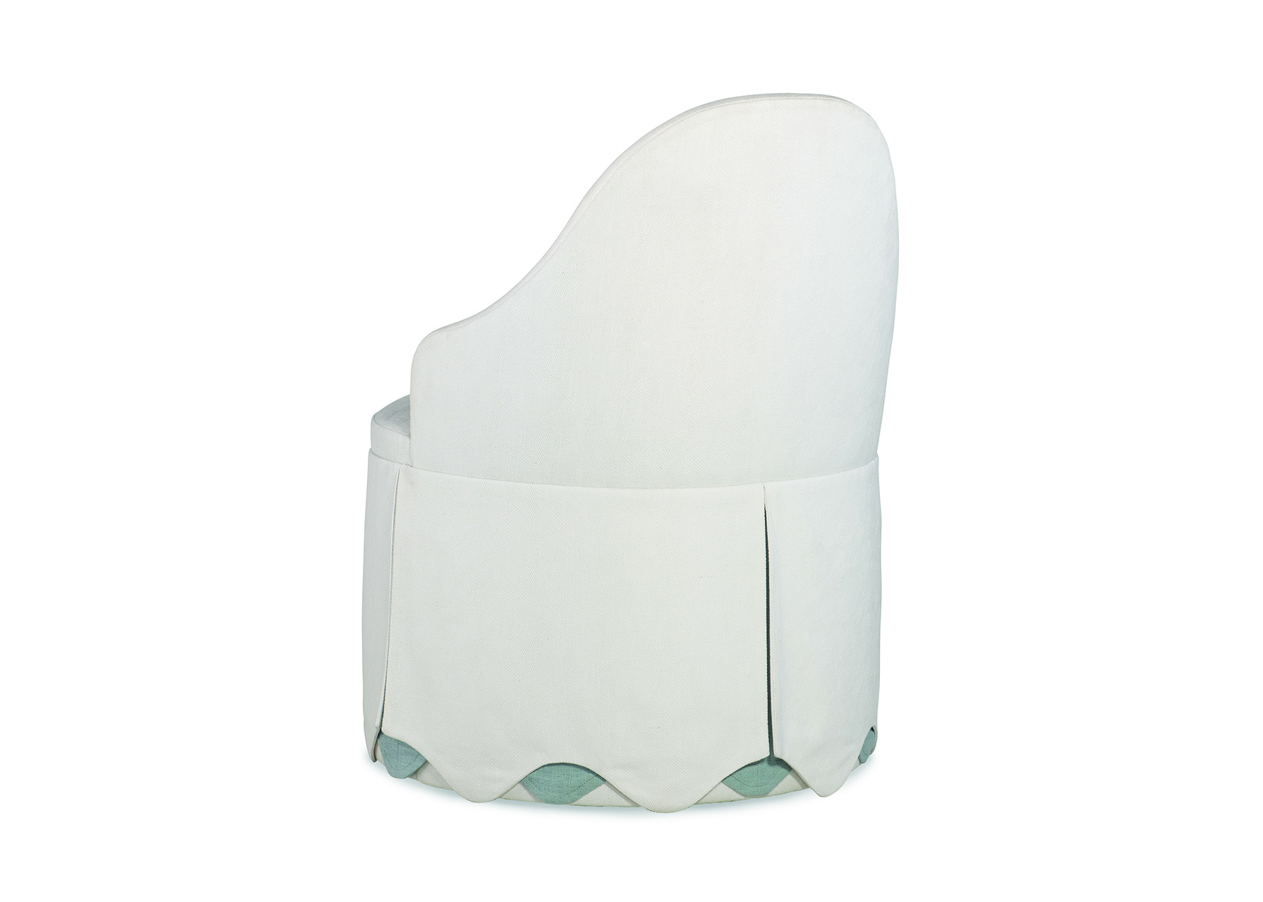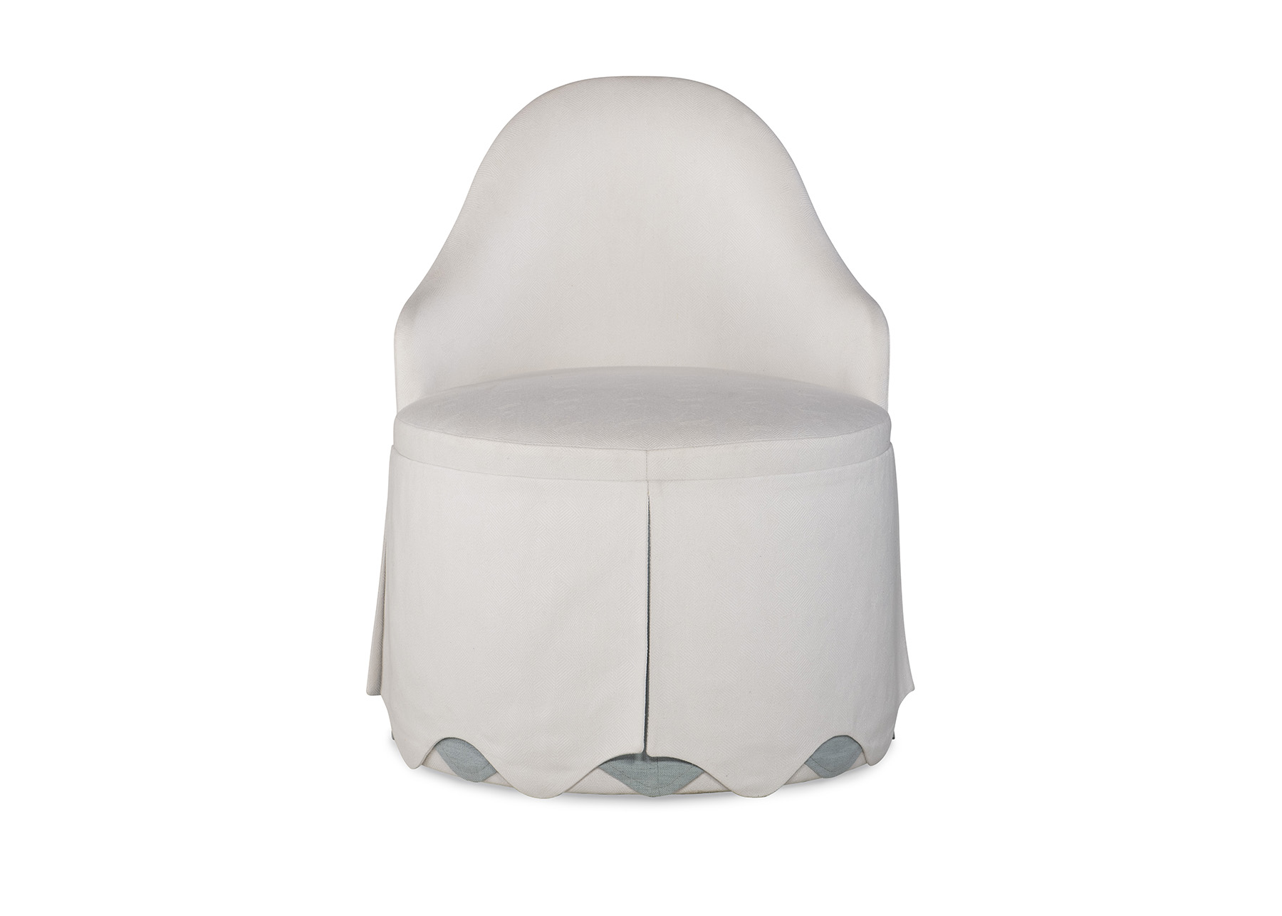 The Emma features a gently curved backrest and a round seat, giving it a graceful silhouette. A tailored slip skirt surrounds the base, finished with a scalloped hem that reveals a contrasting inner layer for a touch of playful refinement.