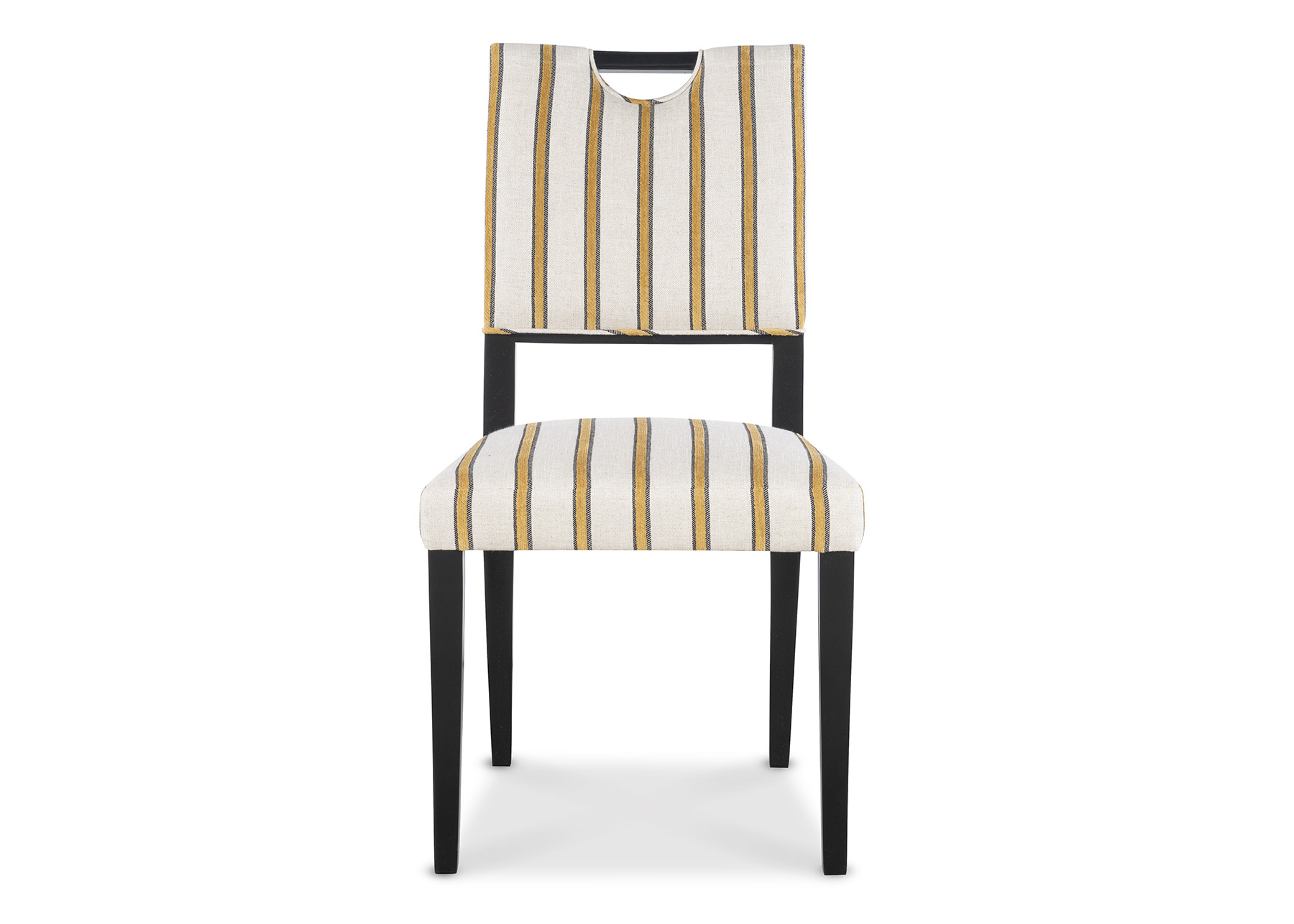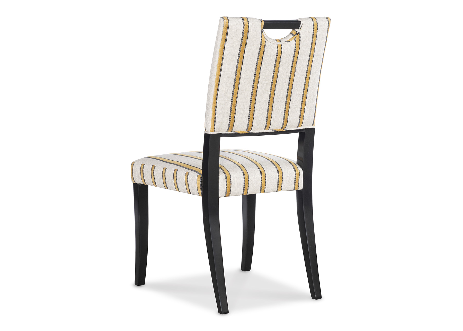 Simple styled dining chair with slightly arched back and wood exposed handle for ease of pulling away from table.