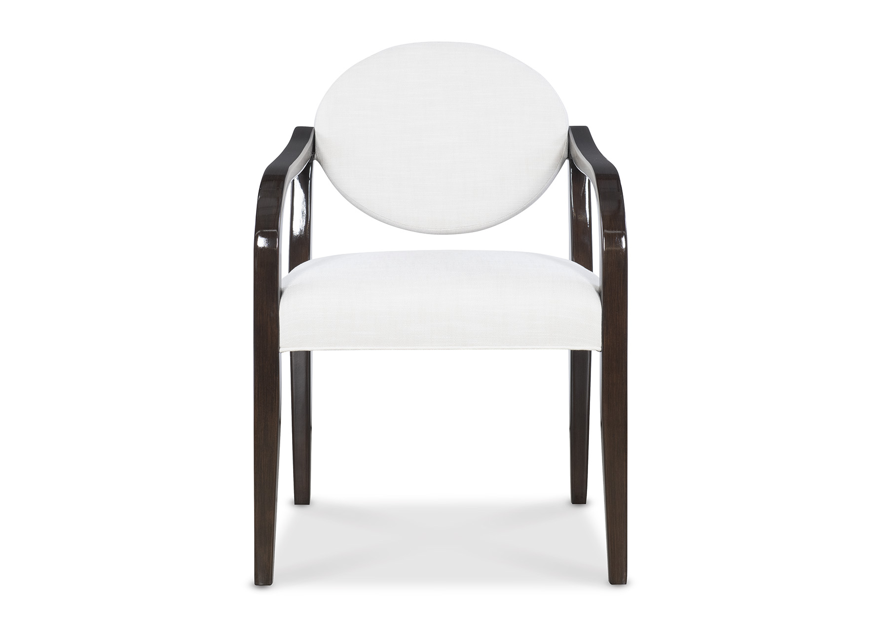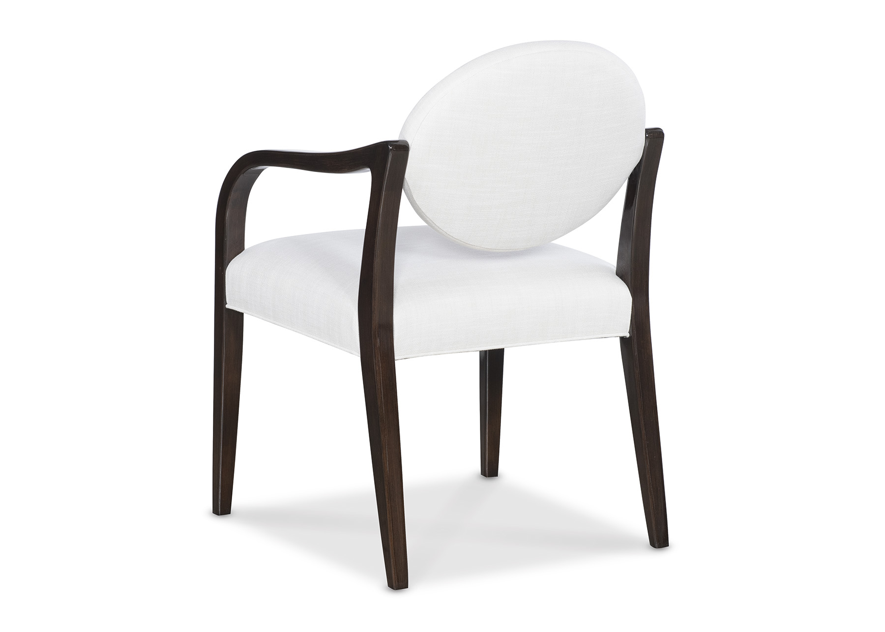 Oval shaped back freely suspended by exposed wood frame creates an elegant and modern feel to this dining chair.