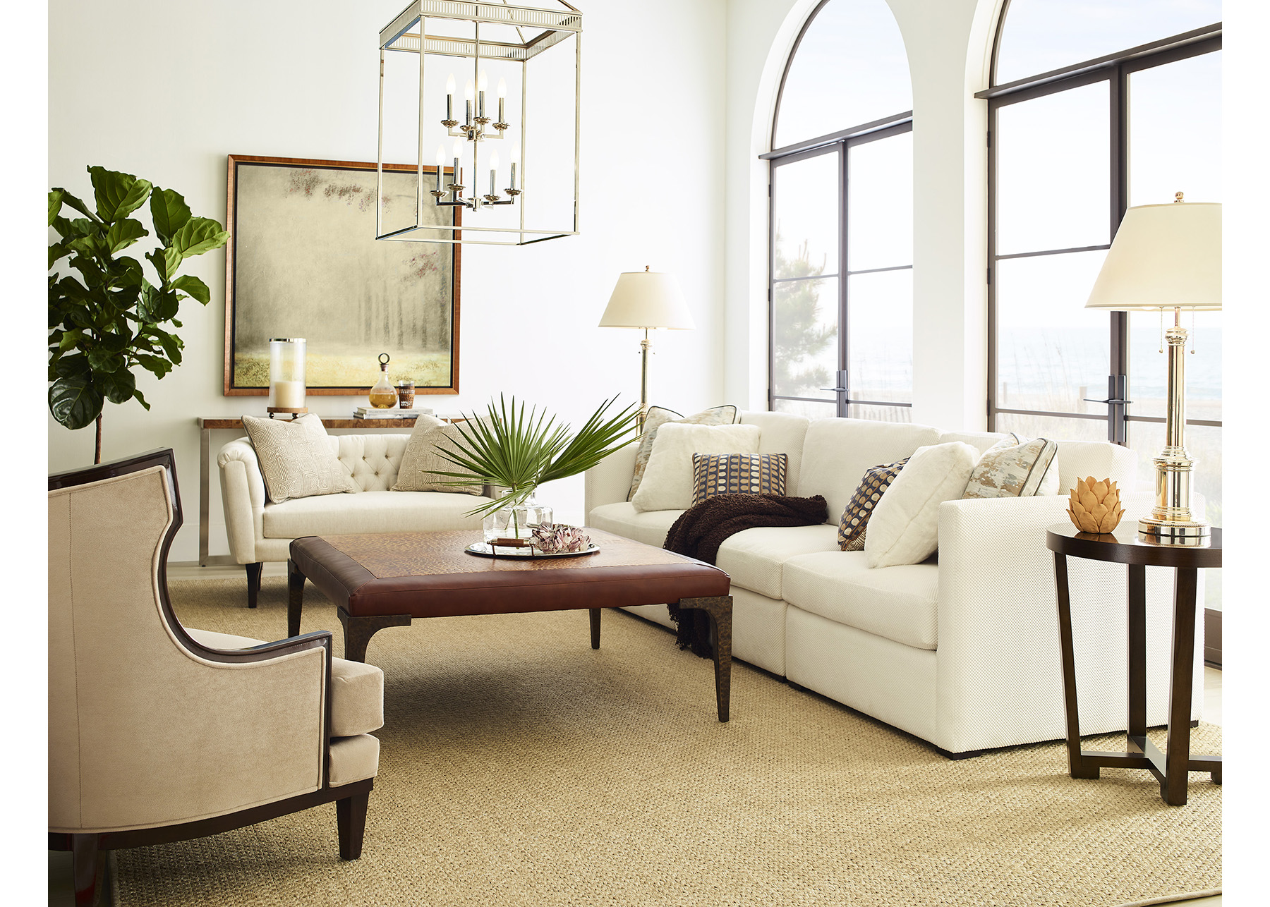 1st Room Scene: Newton Mist with Cashew finish. Pillows in Floza Sea. Shown with Maya Chair.