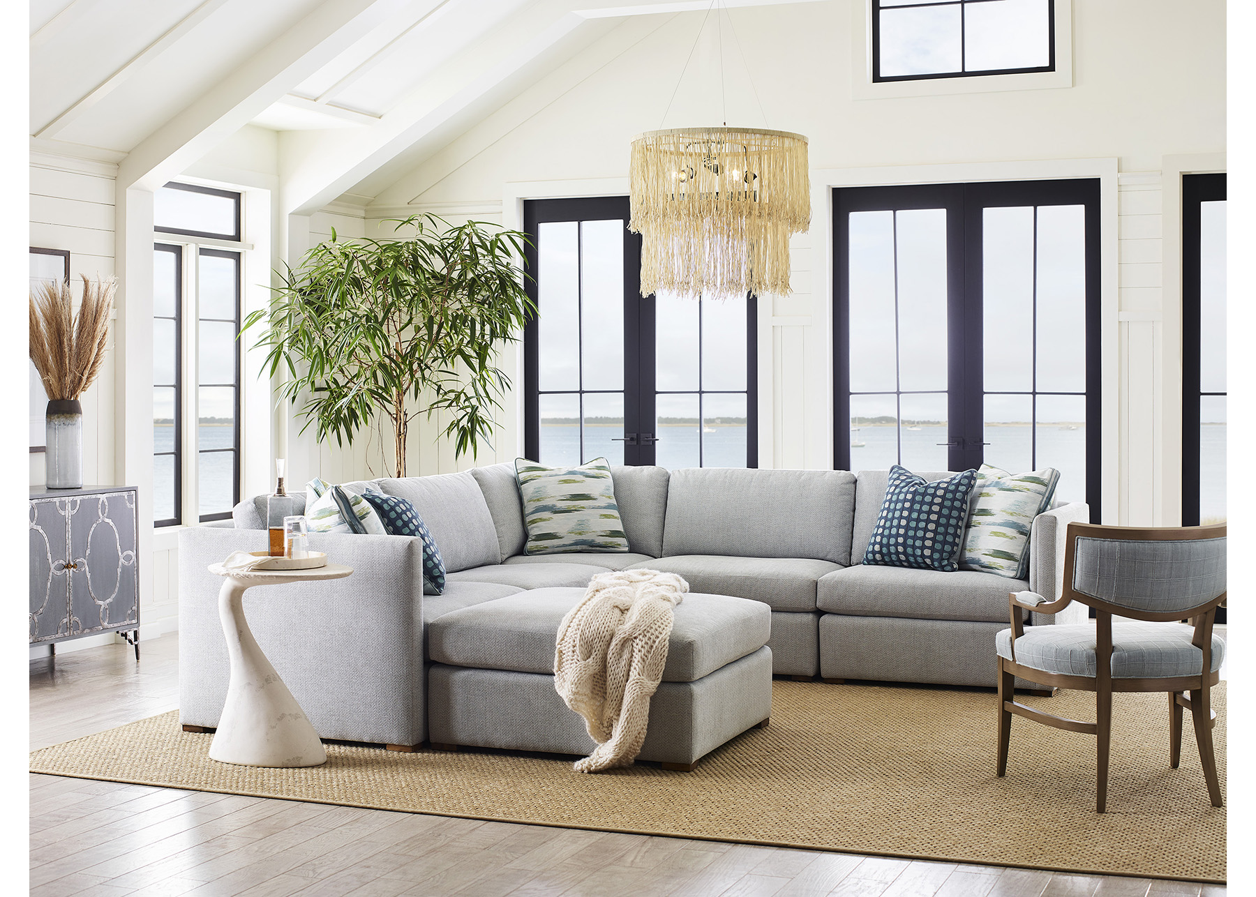 Room Scene: Newton Mist with Cashew finish. Pillows in Floza Sea. Shown with Maya Chair.