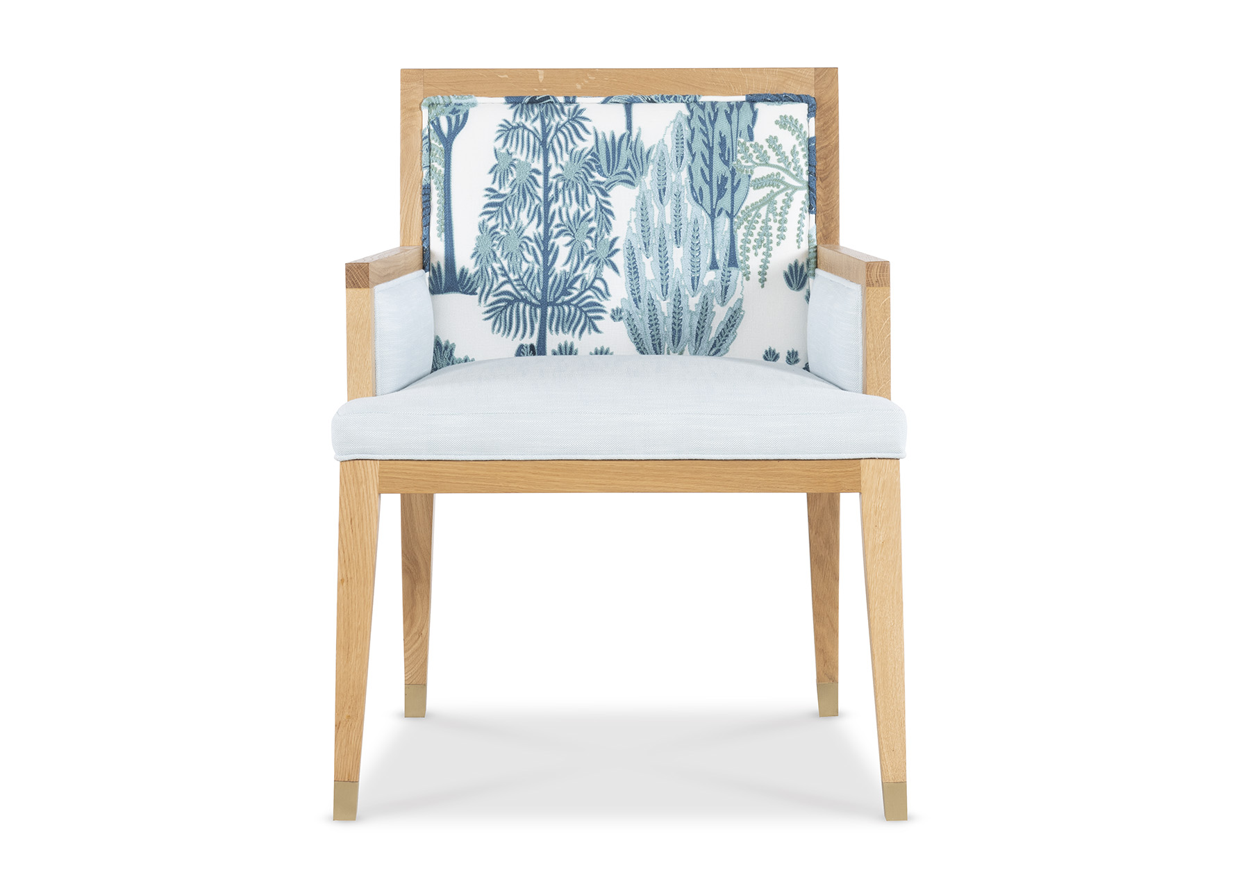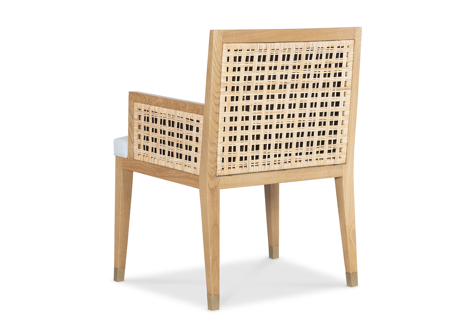With rattan on the outside arms and outback and a natural finish wood frame, this style brings that outdoor look inside for that coastal feel. Fully upholstered on the inside. Serves as dining, guest or game chair.